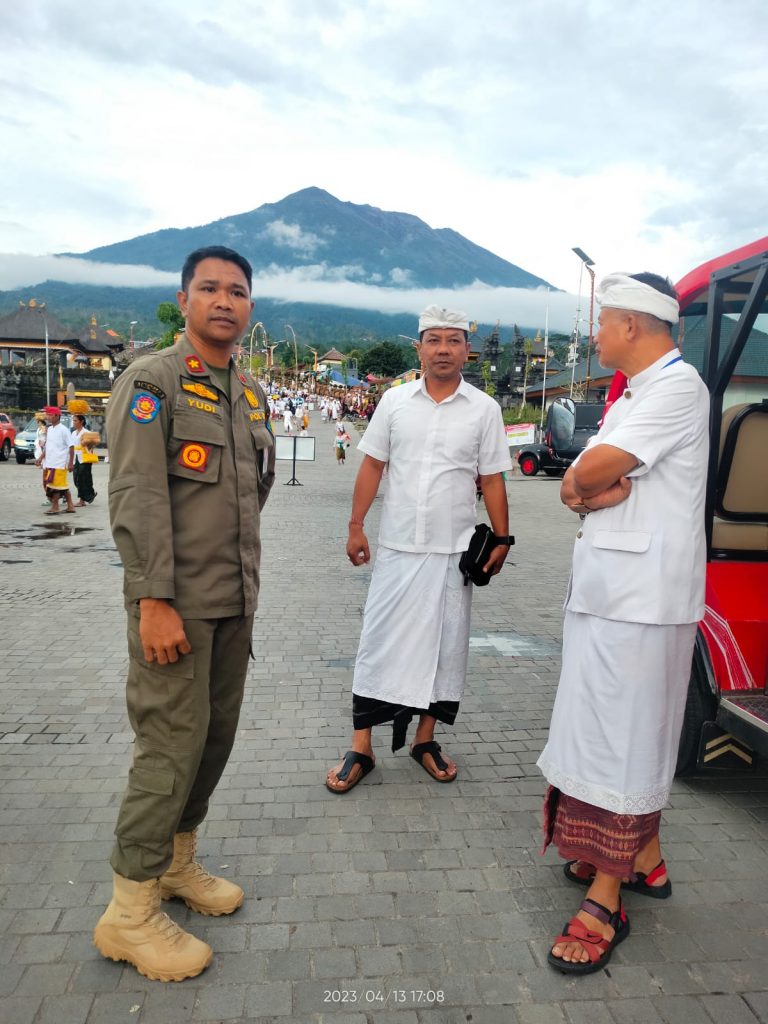 Kepala Satuan Polisi Pamong Praja, Bapak I Dewa I Nyoman Rai Dharmadi,SH. MSi. pantau langsung atensi pengamanan rangkaian Karya Agung Batara Turun Kabeh di Pura Agung Besakih. Tujuannya untuk memastikan pemedek mematuhi peraturan sesuai Surat Edaran Gubernur Bali Nomor 03 Tahun 2023 Tentang Tatanan Baru Bagi Pemedek atau Pengunjung Saat Memasuki dan Berada di Kawasan Suci Pura Agung Besakih selama pelaksanaan Karya Ida Bhatara Turun Kabeh. Yakni Jadwal persembahyangan sudah diatur, pengunjung dari luar Bali mulai 17 April 2023, Pengunjung wajib membawa kantong sampah sendiri, Pedagang diwanti-wanti soal produk plastik sekali pakai dan berdagang di tempat kios yang sudah disediakan. Sehingga kegiatan persembahyangan bisa berjalan secara tertib. Giat dilaksanakan sejak puncak karya hari Rabu tanggal 5 April 2023, berlangsung puncak Karya Agung Ida Betara Turun Kabeh (BTK) di Pura Agung Besakih, Rendang, Kabupaten Karangasem hingga 26 April 2023.