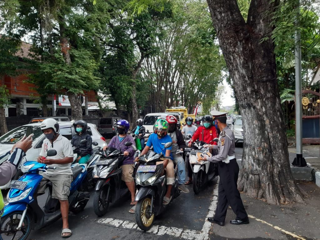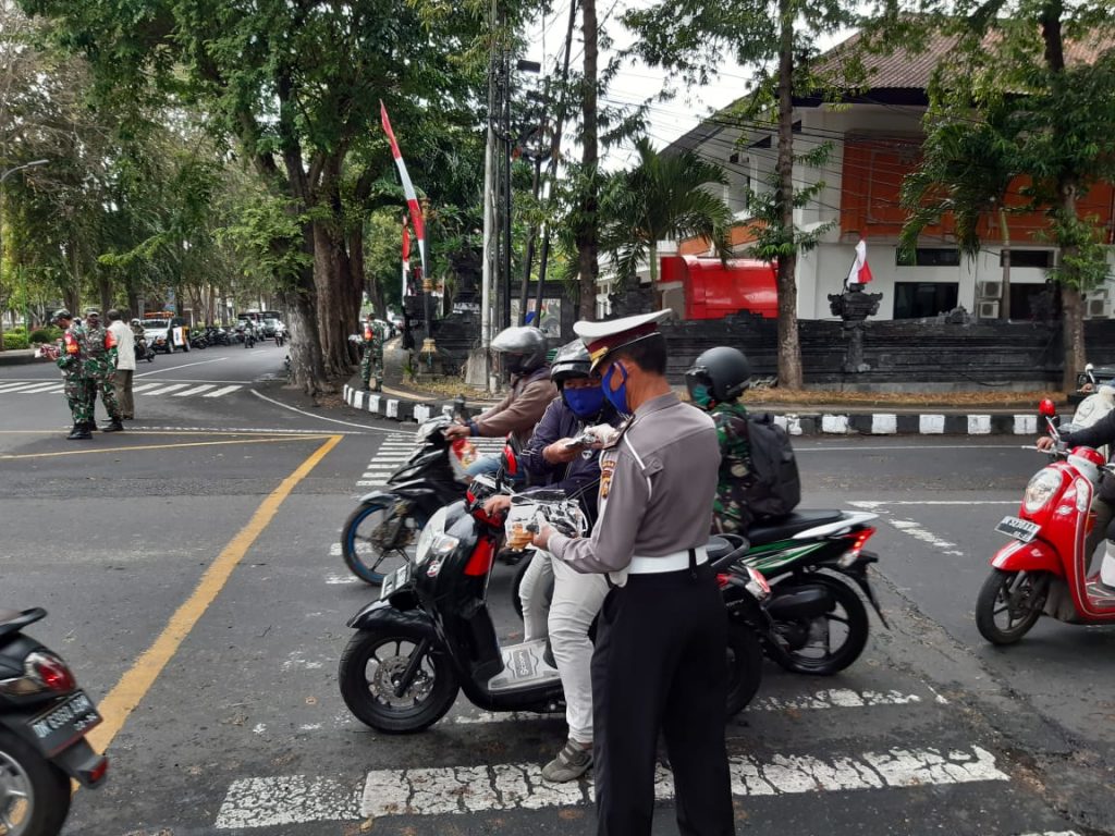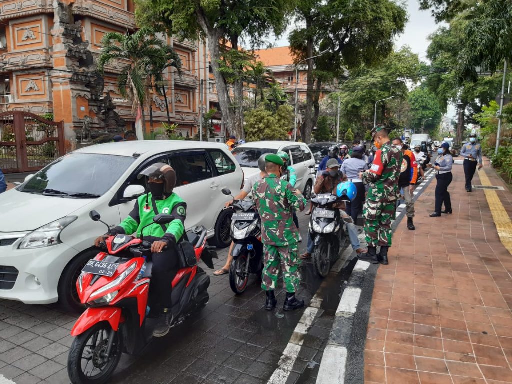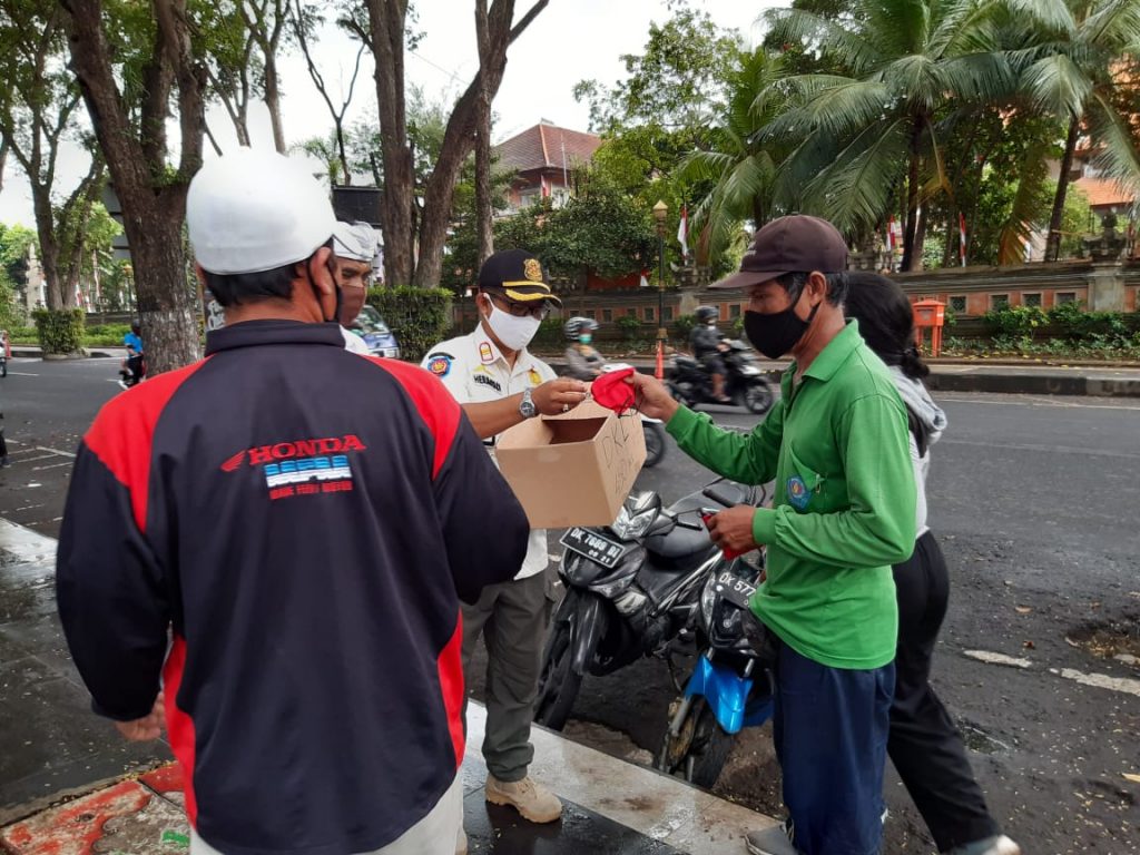 Giat Satuan Polisi Pamong Praja Provinsi Bali bersama Dinas Perhubungan, Satpol PP Kota Denpasar. TNI/Polri,Pecalang dan Relawan Sosialisasi, Edukasi terkait Peraturan Gubernur Nomor 46 Tahun 2020 Tentang Penerapan Disiplin dan Penegakan Hukum Protokol Kesehatan Cegah Penularan Covid-19 disertai Pembagian Masker di Sekitar Lapangan Puputan I Gusti Ngurah Made Agung Denpasar, Rabu 2 September 2020, Tetap Tenang, Waspada dan Disiplin.