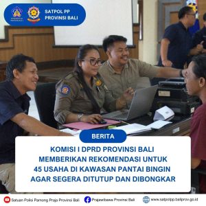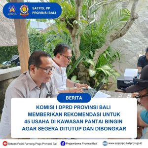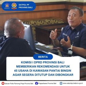Rapat yang berlangsung di Gedung DPRD Bali pada Selasa 10 juni 2025, turut hadir Kepala Satuan Polisi Pamong Praja Provinsi Bali, Kepala Dinas PUPR Provinsi Bali dan sejumlah instansi terkait. Rapat ini merupakan lanjutan dari berbagai langkah yang telah dilakukan oleh Satpol PP Provinsi Bali bersama pihak terkait seperti Sidak, pemanggilan pelaku usaha dan penjemputan ke lokasi bagi pengusaha yang tidak hadir pada undangan klarifikasi.