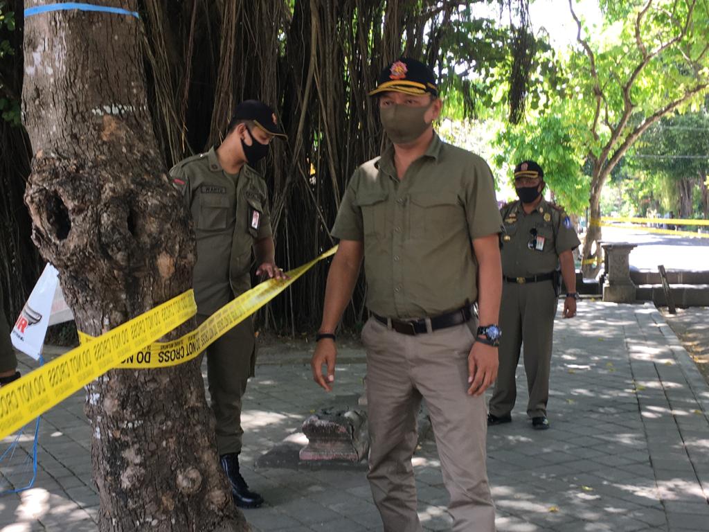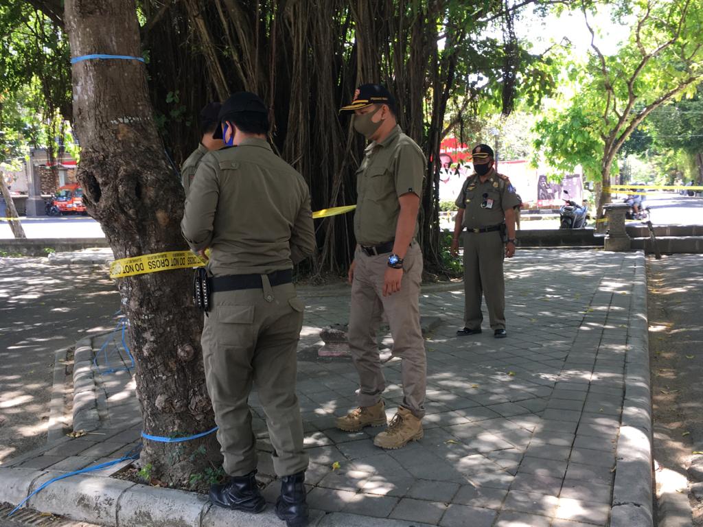Pemasangan Police Line di Lapangan Puputan Margarana Renon Denpasar untuk mencegah aktivitas masyarakat guna mengurangi terjadinya transmisi lokal Covid-19 oleh Satpol PP Provinsi Bali dipimpin langsung Kasatpol PP Provinsi Bali I Dewa Nyoman Rai Dharmadi, Senin 14 September 2020. Kita Bisa Kita Kuat Kita Menang.