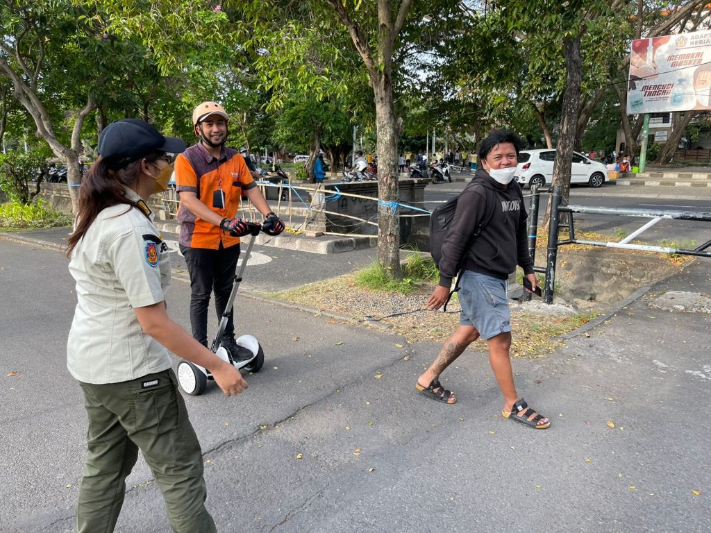 Satuan Polisi pamong Praja Provinsi Bali tidak henti-hentinya melakukan penegakan protokol kesehatan bagi warga masyarakat yang beraktifitas di luar rumah. Semakin longgarnya kebijakan masyarakat tidak seharusnya dapat melanggar protokol kesehatan. Satpol PP tetap hadir dengan humanis memberikan imbauan pada masyarakat untuk patuh pada kebijakan yang dibuat Pemerintah sehingga upaya untuk pencegahan dan pengendalian Covid-19 dapat berhasil sesuai rencana. Lapangan MPRB, 19 Agustus 2021.
